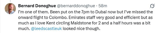 Ahli perjalanan Simon Calder berkata di X: '500 penumpang Emirates yang lepas landas dari Heathrow untukDubaisiang ini tidak sampai ke Maidstone di Kent sebelum para pilot memutuskan untuk kembali karena masalah pada roda pendaratan.